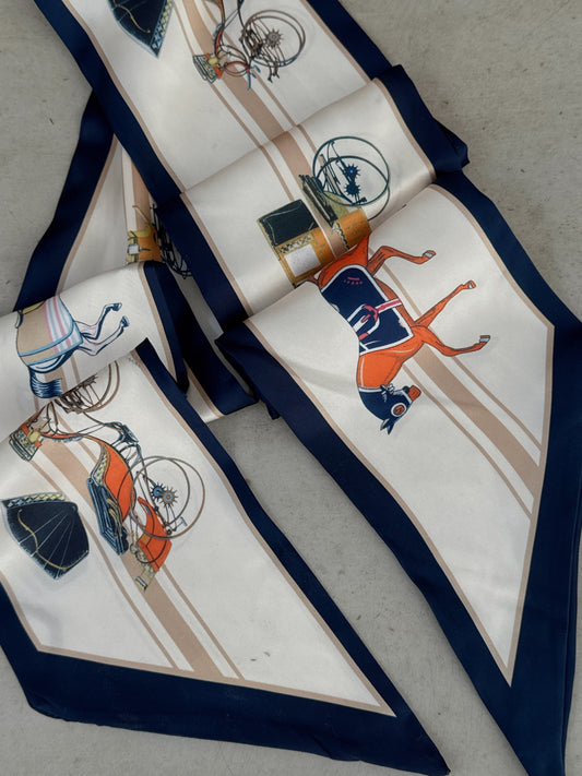 Lacivert Çerçeveli Çift Kat Karışık Figür Desenli Soft Saten Krem Fular