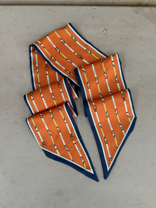Lacivert Çerçeveli Çift Kat Karışık Desenli Soft Saten Turuncu Fular