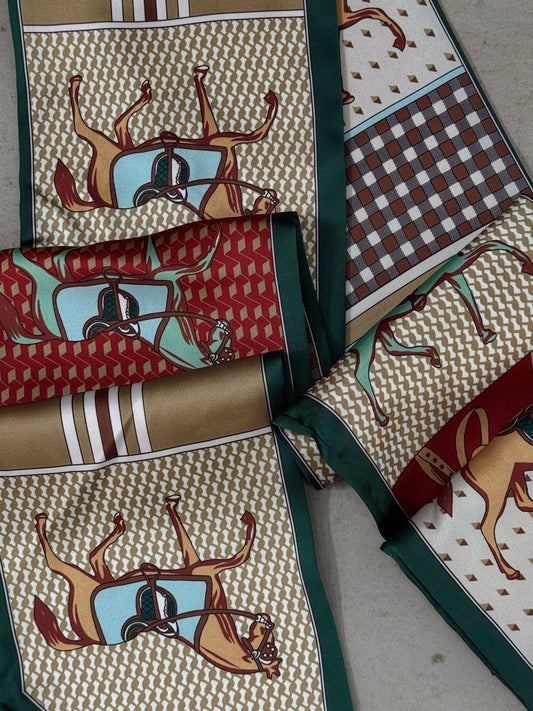 Yeşil Çerçeveli Çift Kat Karışık Figür Desenli Soft Saten Fular