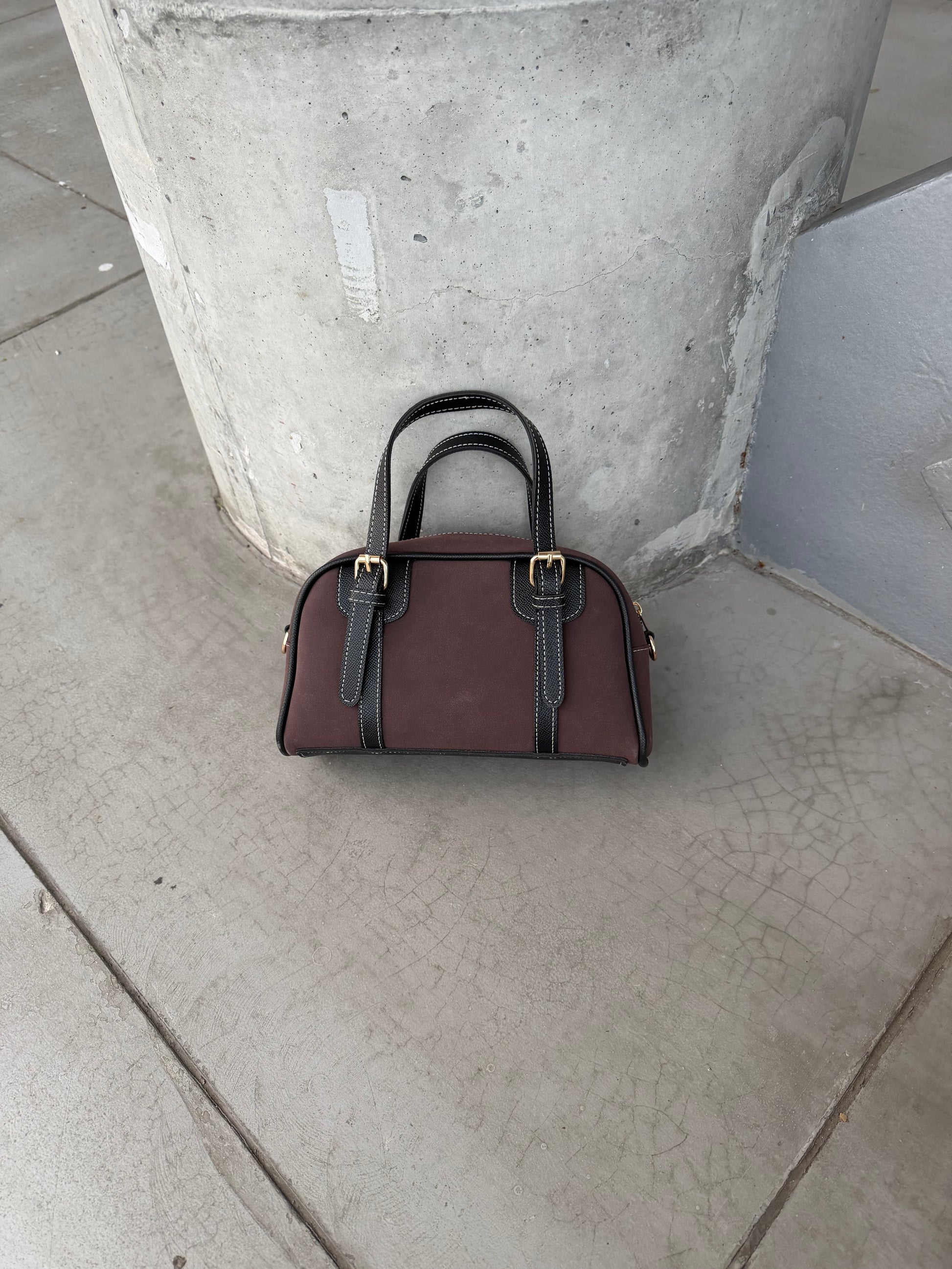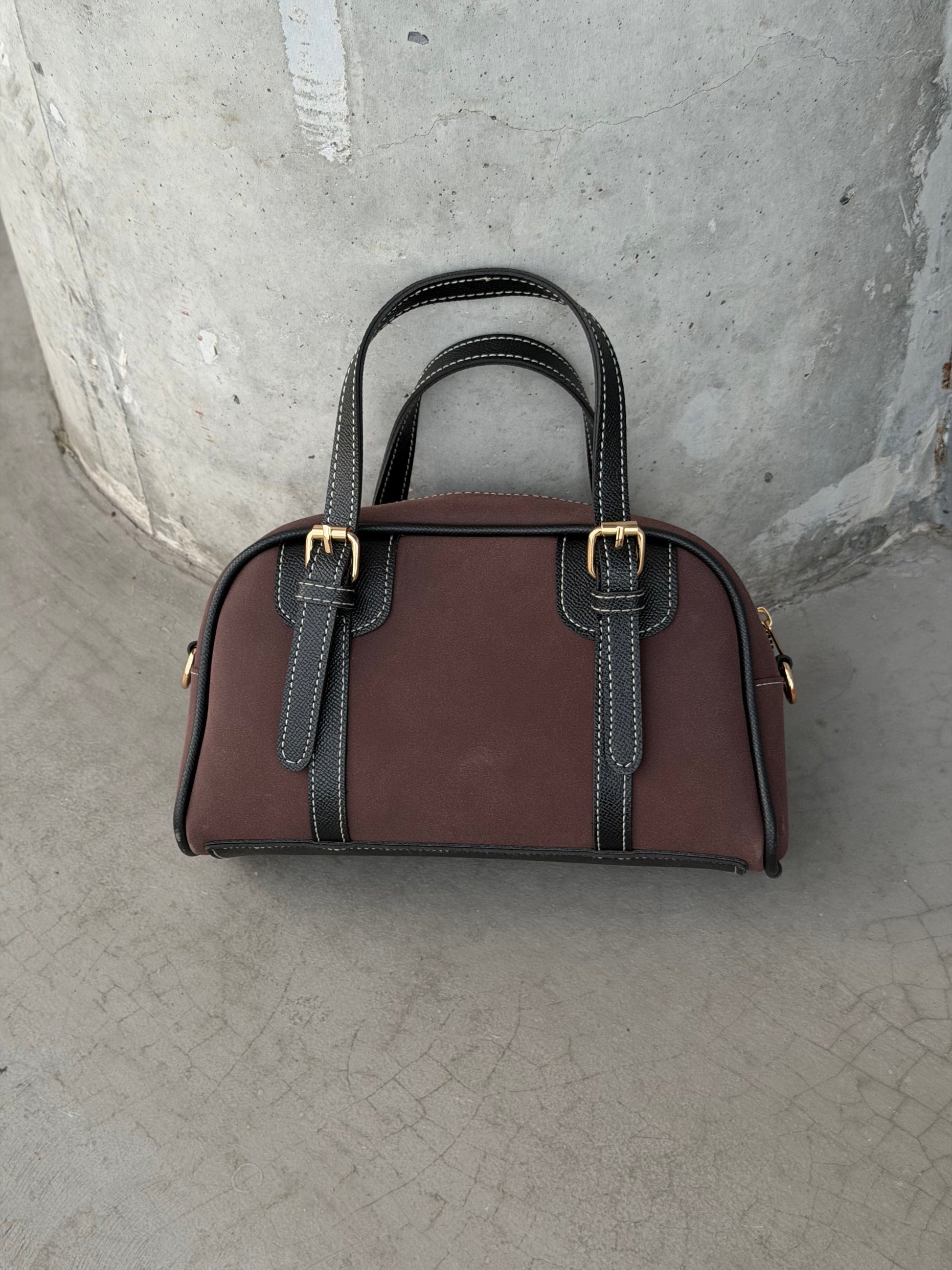 Süet Deri Kombinasyonlu Çift Kemer Detaylı Garne Kadın Çapraz Çanta Kahverengi
